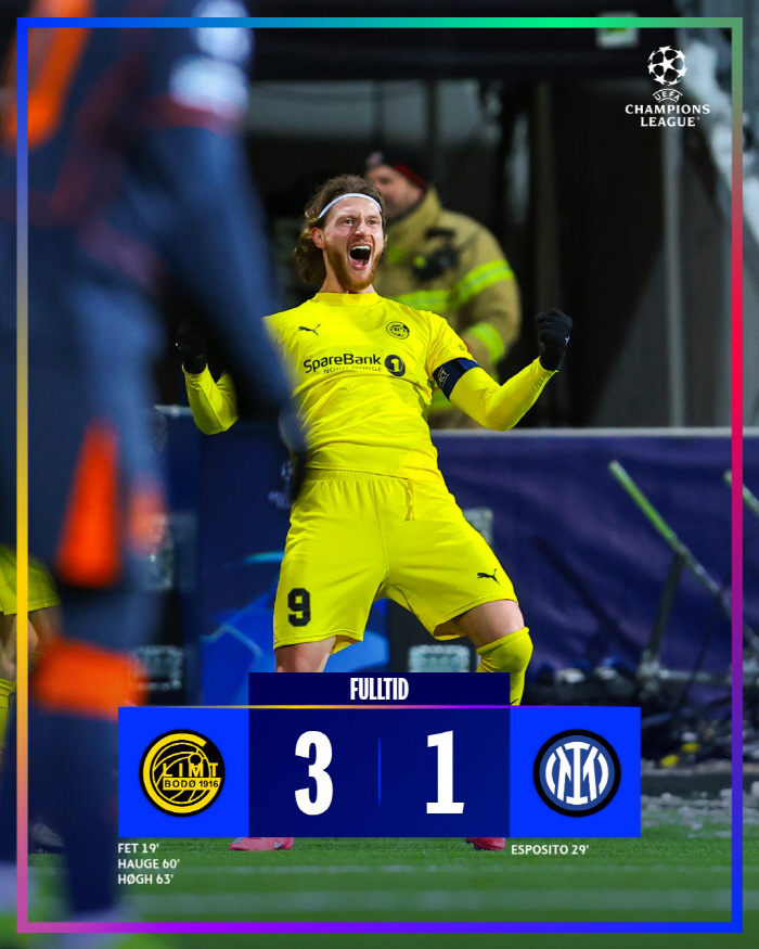 보되/글림트(이하 보되)는 19일(한국시각) 노르웨이 노르드랜드의 아스마이라 스타디움에서 열린 인터밀란(이탈리아)과의 2025~2026시즌 유럽챔피언스리그(UCL) 리그 페이즈 16강 플레이오프(PO) 1차전 홈 경기에서 3대1, 깜짝 대승을 따내며 16강 진출에 성큼 다가섰다.