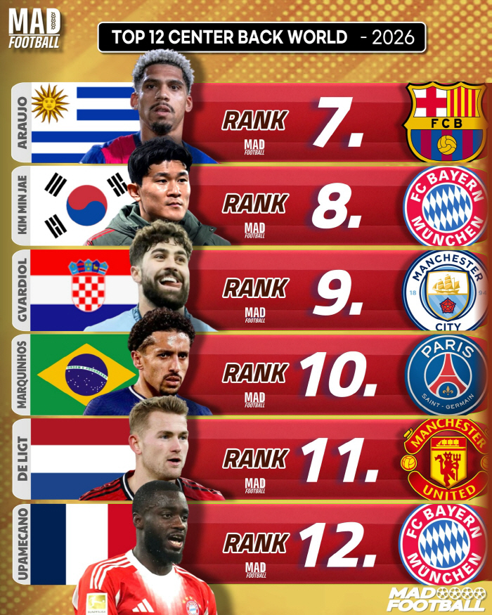 글로벌 축구 콘첸츠 매체인 매드풋볼은 15일(한국시각) '세계 최고의 센터백들'이라며 뛰어난 기량의 센터백 선수들 순위를 공개했다.