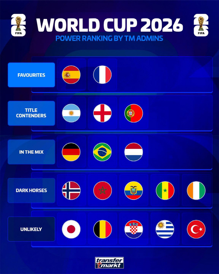 이적시장 전문 매체 트랜스퍼마크트는 최근 '월드컵 파워랭킹, 누가 1위일까'라며 2026년 북중미월드컵 파워랭킹을 공유했다.