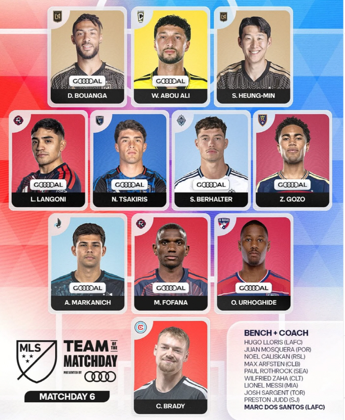 미국 메이저리그사커(MLS) 사무국은 7일(이하 한국시각) 6라운드 베스트 11을 공개했다. 손흥민이 드니 부앙가와 함께 스리톱에 이름을 올렸다. 손흥민이 2026시즌 MLS '이 주의 팀'에 선정된 것은 이번이 처음이다.