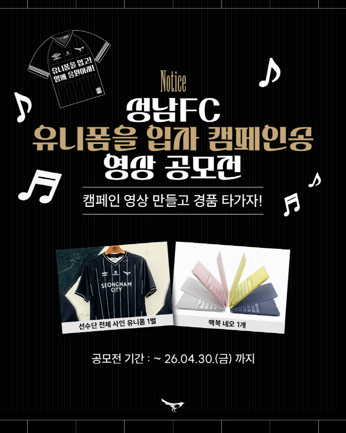 심사를 통해 최종 선정된 1명에게는 우승 특전으로 최신형 노트북인 '맥북 네오' 1대와 함께 성남FC 선수단 전원의 친필 사인이 담긴 유니폼 1벌이 부상으로 수여된다.
