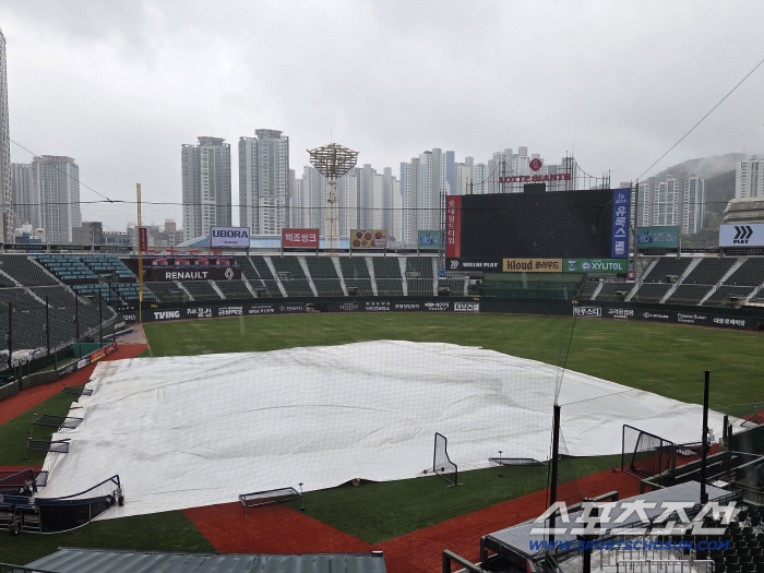 부산은 아침부터 흠뻑 젖었다. 사직구장도 대형 방수포를 미리 덮어뒀지만 그라운드 곳곳에 웅덩이가 생겼다.
