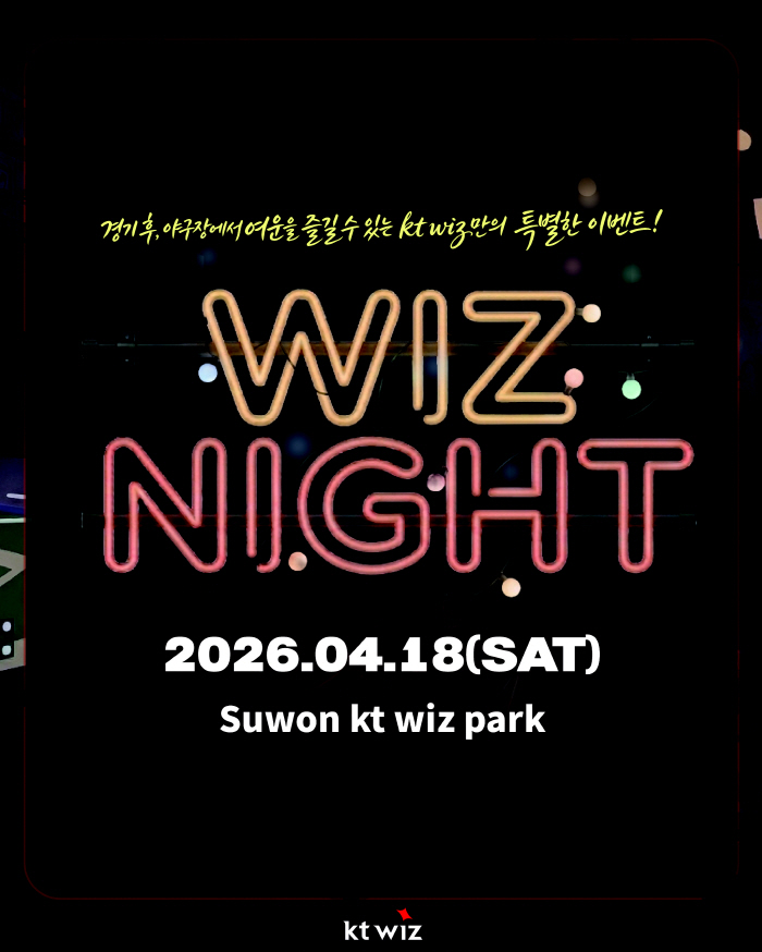 KT는 오는 18일 키움 히어로즈전 종료 후 위즈파크 2층 F&B 구역에서 야장 콘셉트의 '위즈 나잇(WIZ NIGHT)'를 운영한다.