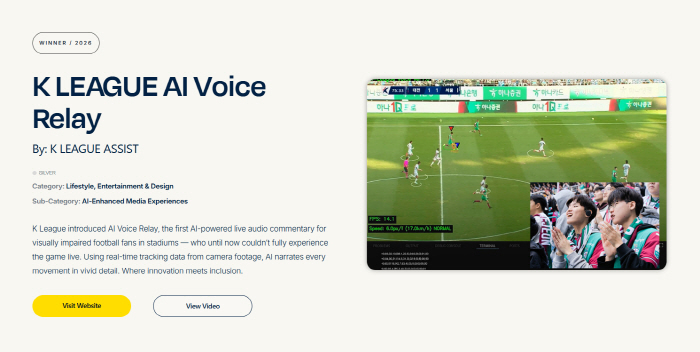 AI 음성 중계는 지난해 11월 대전월드컵경기장에서 열린 K리그1 35라운드 대전하나시티즌과 FC서울 경기에서 처음 시범 운영됐다. 당시 시각장애인 축구팬 한종민군과 쌍둥이 동생 한종서군을 초청해 직접 체험할 수 있도록 했다. 한국프로축구연맹은 “이번 수상은 단순한 기술 성과를 넘어 누구나 함께 즐길 수 있는 스포츠의 가치를 국제적으로 인정받았다는 점에서 주목할 만하다“며 “특히 장애인의 달인 4월에 이뤄졌다는 점에서도 상징성이 크며, AI 음성중계 기술을 실제 경기장에 구현해 스포츠 관람 접근성을 높이고 사회적 포용 가치를 실현한 성과로 평가된다“고 밝혔다.