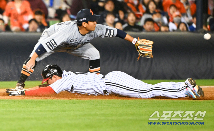 박동원이 한화 선발 왕옌청의 145km 직구를 받아쳐 중전 안타를 만들었다. 타구가 중견수 앞에 떨어지는 순간 1루 주자 오지환은 3루까지 과감하게 파고들었다. 오지환은 몸을 던지며 헤드퍼스트 슬라이딩을 시도했다.