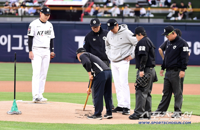 1회초 선발로 마운드에 나선 소형준은 연습 투구 도중 발을 내딛는 부분의 흙이 아스팔트처럼 딱딱하게 굳어 있는 것을 지적했다. 심판들의 지시로 케이티위즈파크 경기장 진행요원들이 마운드에 나와 정비 작업을 펼쳤다. 경기 시작 시간도 4, 5분 늦춰질 수밖에 없었다.
